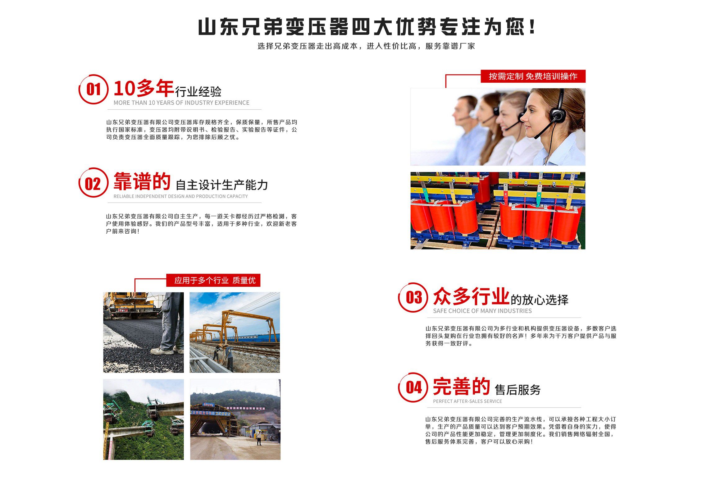 山東兄弟變壓器有限公司經營SCB10干式變壓器,SCB11干式變壓器價格,SCB12變壓器,SCB13干式變壓器,SCB14干式變壓器,SCB18干式變壓器等產品及用戶要求的特殊變壓器?! 」镜馁|量方針是:“顧客的滿意,是我公司的追求。”堅持質量,用戶至上,以質興業,以優取勝,愿為廣大用戶設計各種要求的變壓器,以求共同發展?! ∑髽I精神:“創新、求實、誠信、高效”?! ∑髽I作風:“嚴、細、實、快”?! ∑髽I工作方針:“加強內部管理,夯實基礎,全面提高職工整體素質,使企業管理水平再上新的臺階”?! 」?..